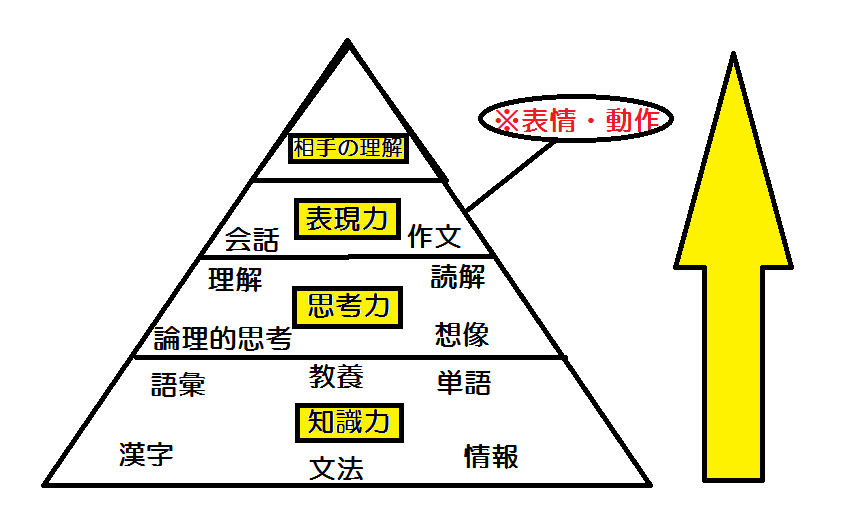 喋ったり、文章を書いたりする力。国語力とは別に、言葉を使わない表情や動作による表現も存在する。